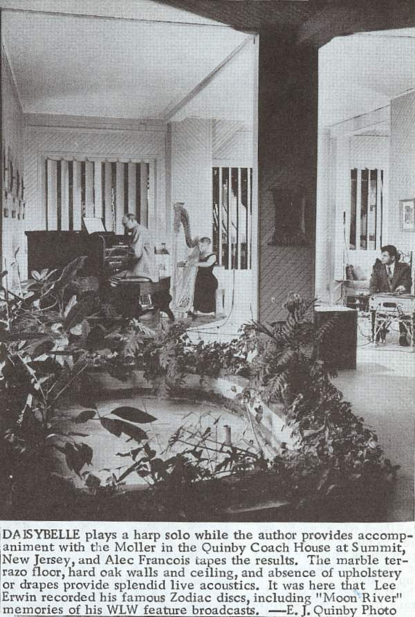 Through the years it has grown to include over 1,000 pipes, and a variety of percussions and traps when we added the whole organ from the State Theatre of Orange, N.J.** and a set of gorgeous Tibias made to order for us by some of the veteran artisans in the Moller plant, with middle-register pipes that are practically cubes. We have learned to avoid proclaiming that the end has been reached. The main floor of our establishment is devoted to the organ, while we roost in the upper region. Daisybelle fortunately shares my enthusiasm for this madness, so there is no prospect of rebellion or divorce.