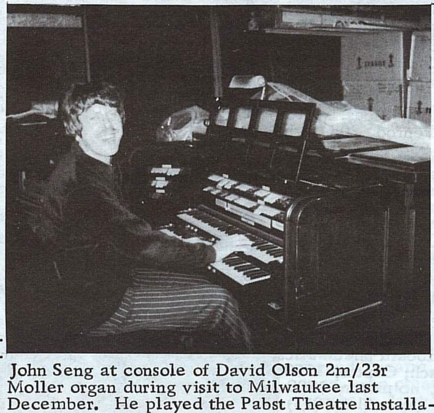 I don't know more about this instrument than what's in the caption. The image looks as though it was taken in a storage facility or a warehouse, so I wonder if this was an installed instrument or a dis-assembled one. I haven't seen a Moller two manual console with tabs on the straight rail as well as on jambs, and it seems odd that they'd have gone to the trouble to include side jambs to accmmodate about 16 more tabs on the left and perhaps a similar number on the right. The piston setter plate (over the top manual) appears longer than needed, considering the number of pistons visible under the upper manual.