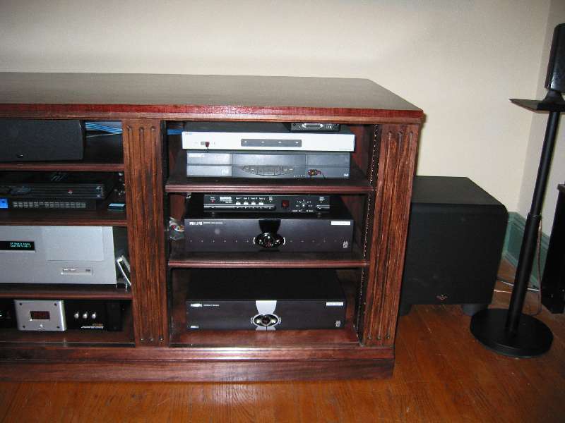 Here's a quick look at a cabinet I made for Larry to hold all his audio and video eqipment. Looks a bit odd since the moldings don't go around to the sides, but that's because the cabinet will slot in (eventually) with built-in cabinets on either side, which will be made in the same overall style. (Click the images for a larger version)