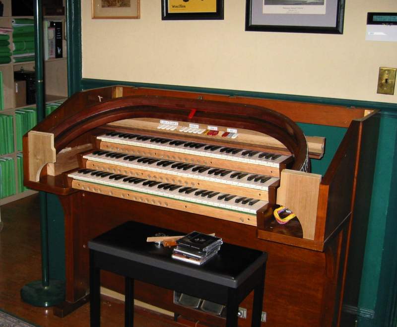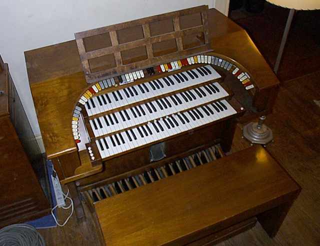 I have made some modifications to this model. Originally the Vox Humana was only available on the Accompaniment at 8', and I have since removed the Great 8' Kinura and replaced it with an 8' Vox Humana. Similarly, I have replaced the 16' Tuba on the Pedal with a 16' Viol, and the 8' Diapason on the Accompaniment with an 8' Tuba. Eventually I will add a few more stops, like a 16' Vox on the Great, 8' Vox on the Solo, and with the filter boards from a 33-E organ, an English Horn at 16' on the Great and 8' on the Solo.