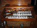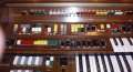The EX-42 looks to be a fairly complex standard analog organ, and from the tone lever organization, it seems as though the flute voices are mixed in along with the reeds and brass (red levers) and the strings (yellow levers), suggesting possibly that the non flute voices are simply organ-type filtered voices. It is not clear whether the two instruments shown here were different model organs or not, as there appear to be very few differences- some of the tone levers are not identical, and the piston arrangements vary slightly. Otherwise, they are quite similar.