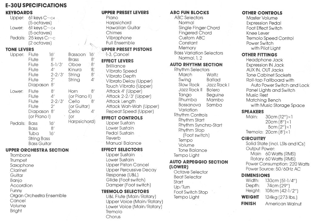 The E-30 is a yet-further reduced instrument from the E-50. It includes tone levers for both flute stops and fixed-filter organ stops (bassoon, oboe, kinura, string, etc.) as well as the synthesizer based "orchestra" section (including trombone, trumpet, saxophone, clarinet, guitar, banjo, accordion and 'funny'). This "orchestra" section, however, is the only synthesizer section in the E-30.