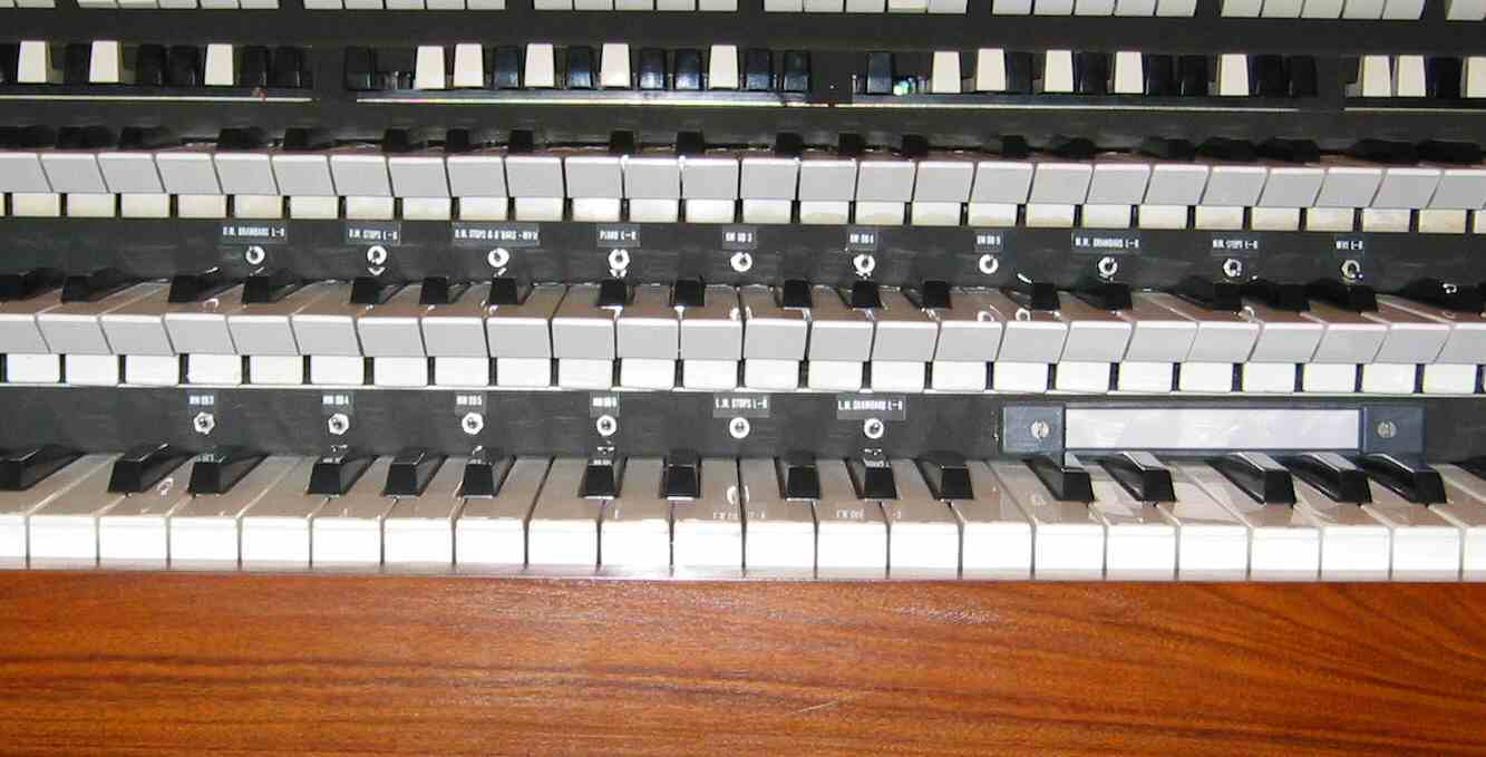 15 stops: Cello 16', Trombone 16', Accordion 16', Flugel Horn 16', Saxophone 16',Horn 8', Viola 8', Clarinet 8', Schalmei 8', Trumpet 8', Flute 4', Violin 4', Principal 2', Cymbal 2 ranks, Mixture 5 ranks