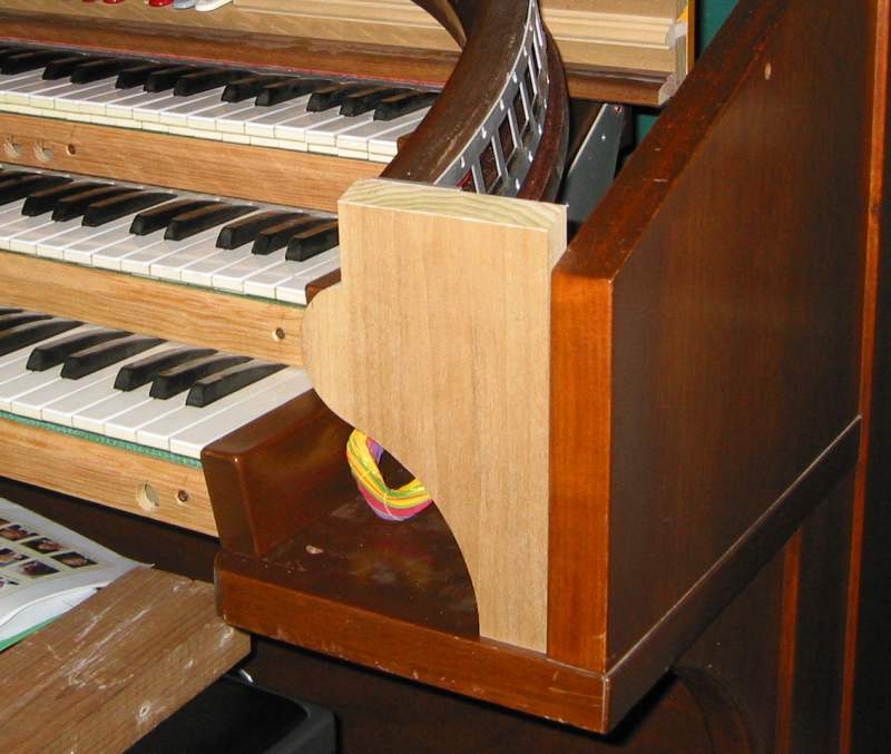 What am I talking about with the words "slightly narrowed"? Well, the Trio console shell is so narrow, that you can't mount a standard dual-magnet stop action between the 'rear' face of the rail at the far left or right ends of the rail, and the left or right inside face of the console. So, this stoprail is narrower, left-to-right, than a normal Trio stoprail. Basically, I cut out a small section in the center of the rail, and spliced it back together without the cut-out section. I lose two tab spaces on the main rail, but since I've added 15 on the backrail, I still have a net gain of 13 stops.